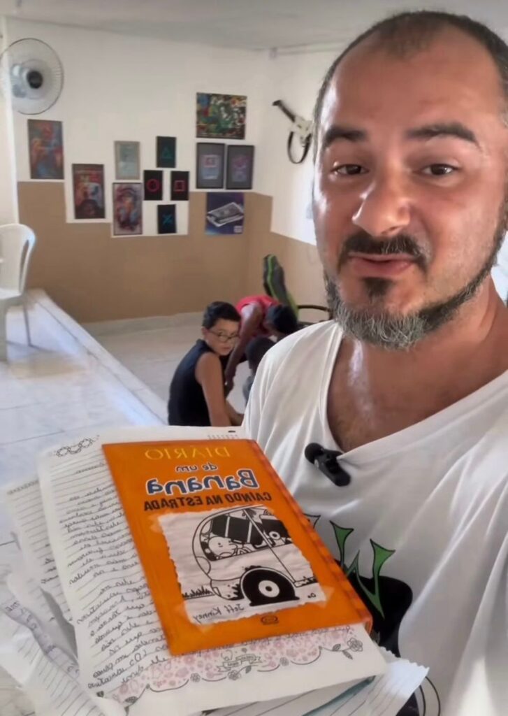 A proposta, chamada de “troca da hora”, oferece tempo gratuito de jogo para jovens que dedicam alguns minutos à leitura e registram, em um breve resumo, o que compreenderam do conteúdo. A ideia nasceu de uma memória pessoal marcada pela falta de acesso. “Na minha infância eu fui essa criança que passava muita vontade, principalmente com respeito aos games. Eu nunca tive um videogame próprio, então sempre recorria a fliperamas e lan houses, e quase sempre era só para ficar olhando”, conta. Ao perceber que a mesma realidade se repetia entre os frequentadores de sua Game House, muitos deles sem recursos sequer para pagar uma hora de jogo, decidiu transformar a leitura em uma alternativa concreta de acesso. “Resolvi criar a troca da hora, que é basicamente a criança ler um determinado período de tempo para poder ganhar um período de game play.”